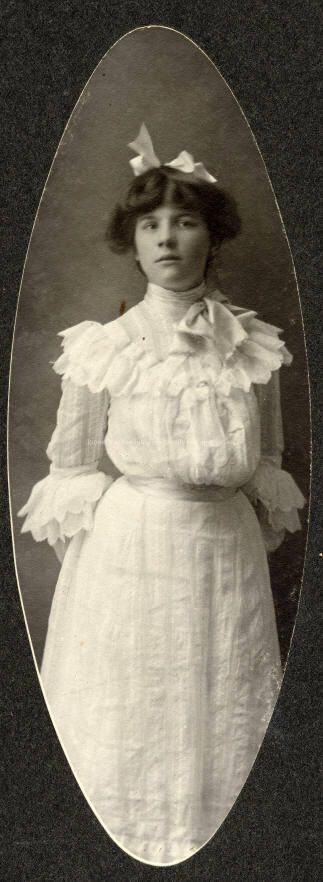 Unidentified woman, 3/4 length portrait, she is wearing summer white lawn, ruffled yoke, bowtie at throat, ruffles on sleeve edge and ribbon belted waist..hair is center parted and drawn back loosley, ribbon in her hair. the Majestic, Sonora Cal Photography.