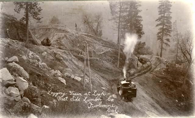 5x7 7/8 " print mounted on board showing train pulling logs. A woman stands at the upper left corner, and a man is riding on one of the loaded logs.
