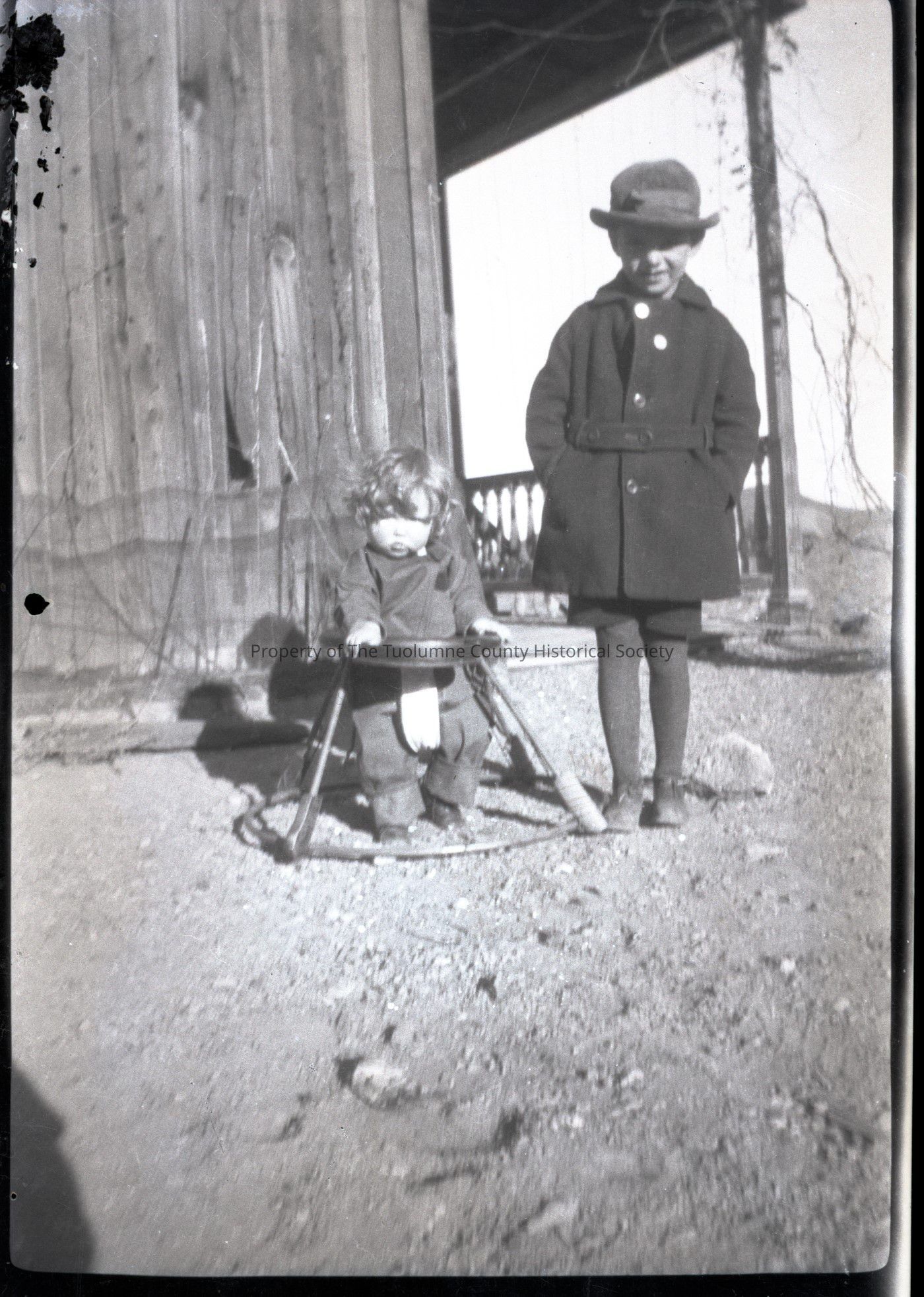 Black and white photo of two unidentified small children, one standing and one in a walker.