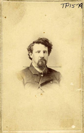 Portrait-Man not identified. Two,1 cent stamps on back "Proprietary" with hand written initials "D S" and Date "Oct 1865". Man is dressed in a dark double breasted coat with white shirt. Curly hair parted on the side. He has a goatee. Type: Paper
