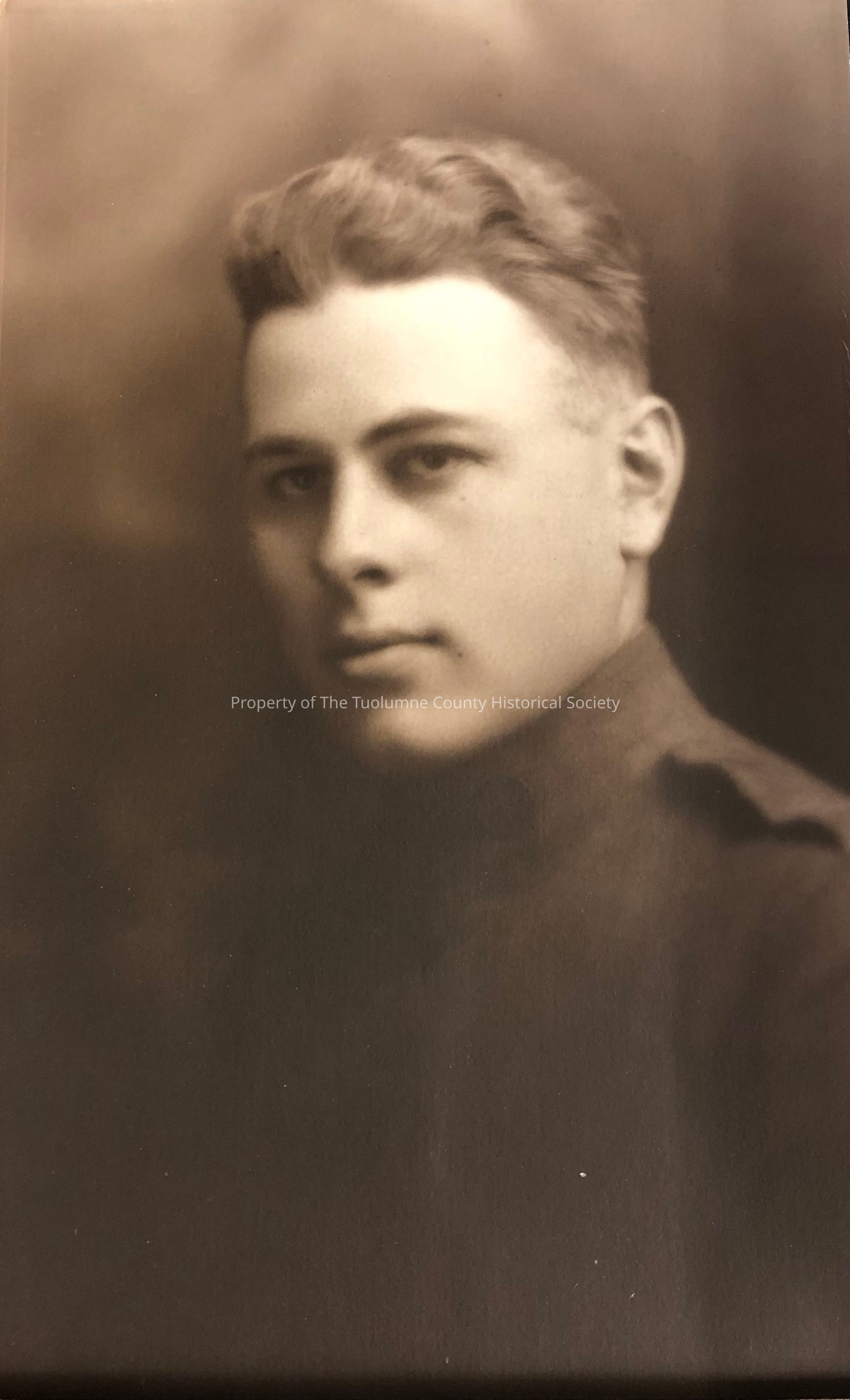 Unidentified young man, looks to be in military uniform from WWI. Photograph was taken in Waco, TX by Drummond.