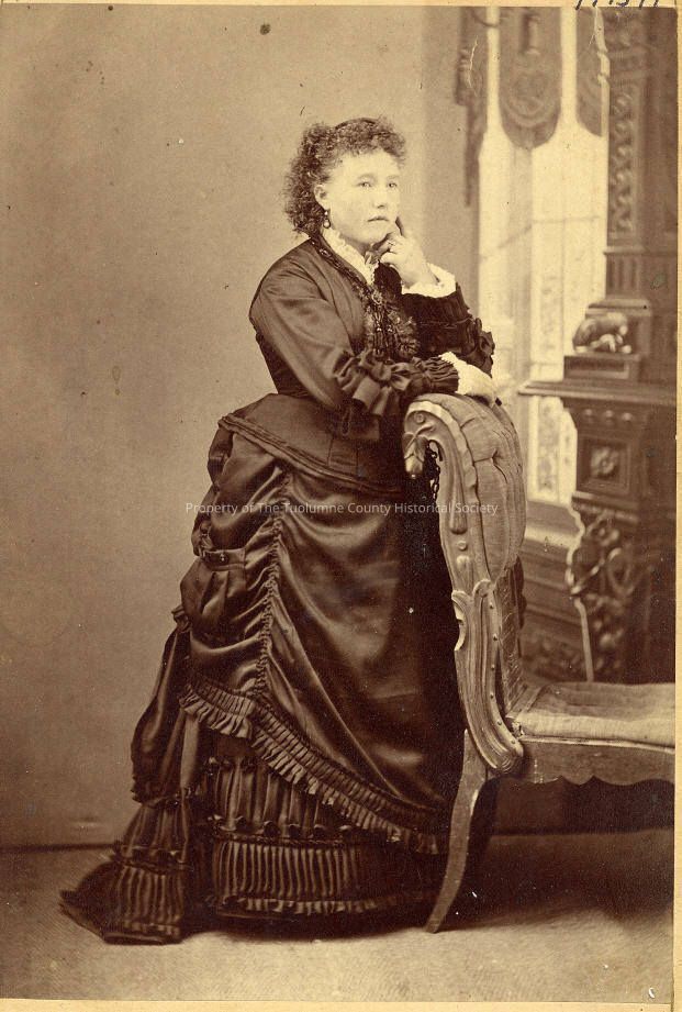 Portrait of a young lady - not identified. Time period is prior to 1880. In a studio with a window, hutch and a chair. She is standing behind the chair with both of her arms resting on the top of the back of the chair. One arm is laying across the chair. The other is bent at the elbow with her hand at her face. Dark color long sleeve dress with bustle and a cummerbund. She has lace cuffs and collar. There's a ring on her right hand and is wearing earrings. Hair is center parted and drawn back over the ears and is held with a head band.