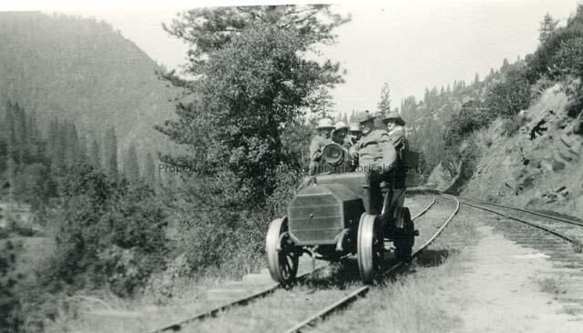A rail car escorts some dignitaries on a tour of Hetch Hetchy.