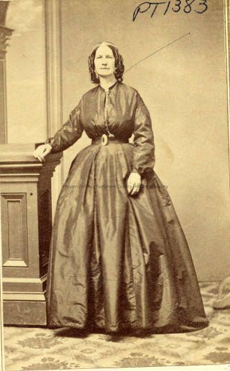 Unidentified woman, full length portrait. She is standing next to wooden column with her right hand resting on the column, wearing a dark colored dress with no collar, long sleeves from dropped shoulder, belted at natural waistline, probably over hoop, no bustle, hair is center parted and curls falling over ears she appears to be wearing a cap or hair decoration.
