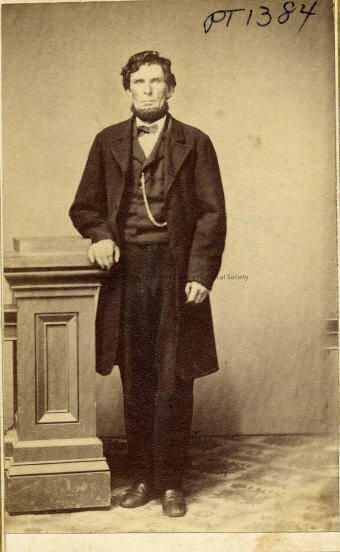 People, Unidentified man, Portrait, full length, Men's fashions, Men's hairstyles, Men's Beards, Sewell's Art Gallery, Sonora, Unidentified man, full length portrait. Subject is pictured standing next to wooden column, he is wearing a knee length frock coat with wide lapels and dark slacks, over a satin (waistcoat) double breasted vest with lapels, a watch chain from the top buttonhole of the vest to left vest pocket, white shirt, with bow tie, plain toed shoes, his left hand rests on the column right hand at his side. He has curly hair and a full chin beard ,no moustache.