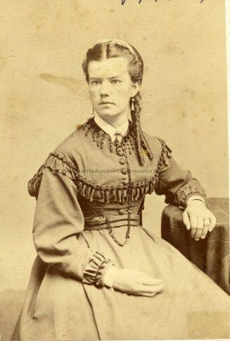 Unidentified woman, 3/4 portrait. She is seated with her left arm resting on cloth covered table, dressed in medium colored dress, snug fitting bodice, button front, neckline and wide yoke is trimmed in fringe, yoke also edged in self ruffles, self ruffles at sleeves, drop shoulders full sleeves, white split collar shows at the neckline, fastened with decorative pin. Chain descends to her belted waist. Small drop earrings, hair is center parted and drawn behind her ears into long ringlets, appears to have a bandeau holding back the hair.Collection