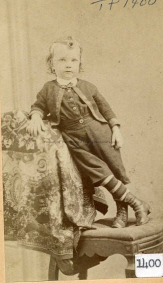 People, Unidentified boy, Unidentified male child, late 1800-early 1900, Child approximate age 4-6 years, Children's fashions, Children's hair styles, Sewell's Art Gallery, Sonora, Unidentified child, boy is pictured standing on a chair and leaning against the back with a shawl covered (table) with his feet crossed above the ankle, he is dressed in a knee length jumpsuit, buttoned at the waist and up the center front of the shirt, a grograin trimmed jacket tops the outfit with a white rounded collar at the neckline, he is wearing knee high striped stockings and high, buttoned shoes. His hair is parted on both sides with a curl brought down the center.