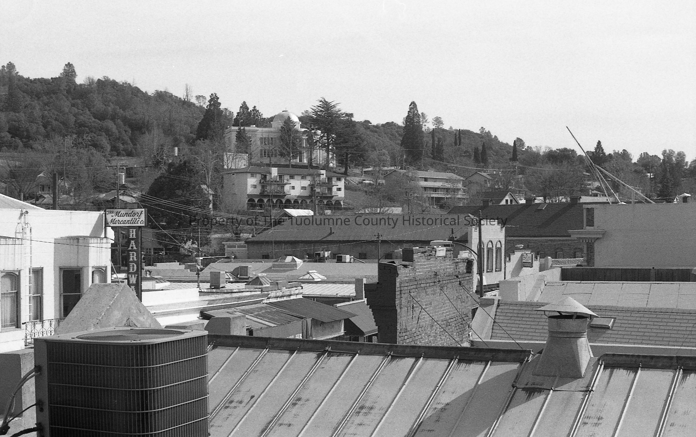 Sonora rooftops on Washington St. and the old Sonora Elementary School Dome. 2 photos. 1994