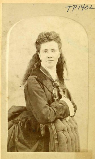 Unidentified young Woman, Victorian clothing, Unidentified young woman, late 1800-early 1900, Women's fashion, Women's hair styles, Bustle, Sewell's Art Gallery, Sonora, Unidentified young woman, 3/4 length portrait. She is shown leaning against the back of an upholstered chair, arms resting across the back of the chair, she is dressed in a dark dress with a fabric lapel at the front of th bodice. bodice is snugly fitted with smooth shoulder, full sleeve with lace at the cuff, a white lacy collar is visible with a light colored scarf tied loosely near the lapel, a bustle is visible in the photograph with ribbon decoration, her hair is worn with half dressed on her head and the rest loose around her shoulder,