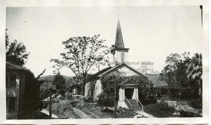 Methodist Church, Sonora. Homes beside and behind church. Edge of Tuolumne County Courthouse showing lower left of photo. Frontal view of church with steps leading up to the doorway. Power poles next to courthouse. Trees, bushes, and landscaping around church.