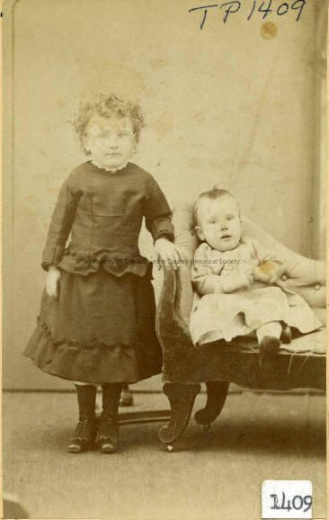 Unidentified children, Unidentified girl, Unidentified baby, Unidentified children, Young girl, Infant, Childrens fashions, late 1800- early 1900, Children's shoes, Sewell's Art Gallery, Sonora, Unidentified children, full length portrait, pictured standing on either side of small shawl covered table, hands placed on book, girl is wearing full ankle length skirt, white button front blouse and cropped jacket, the skirt is gathered and belted at the natural waist, lace up boots, her hair is center parted and drawn behind her ears. The boy is wearing dark trousers, lighter colored jacket with curved cut at the hip, small lapel, buttoned close to neck, white shirt, dark bow tie, his hair appears to be parted on the right and combed to the left.
