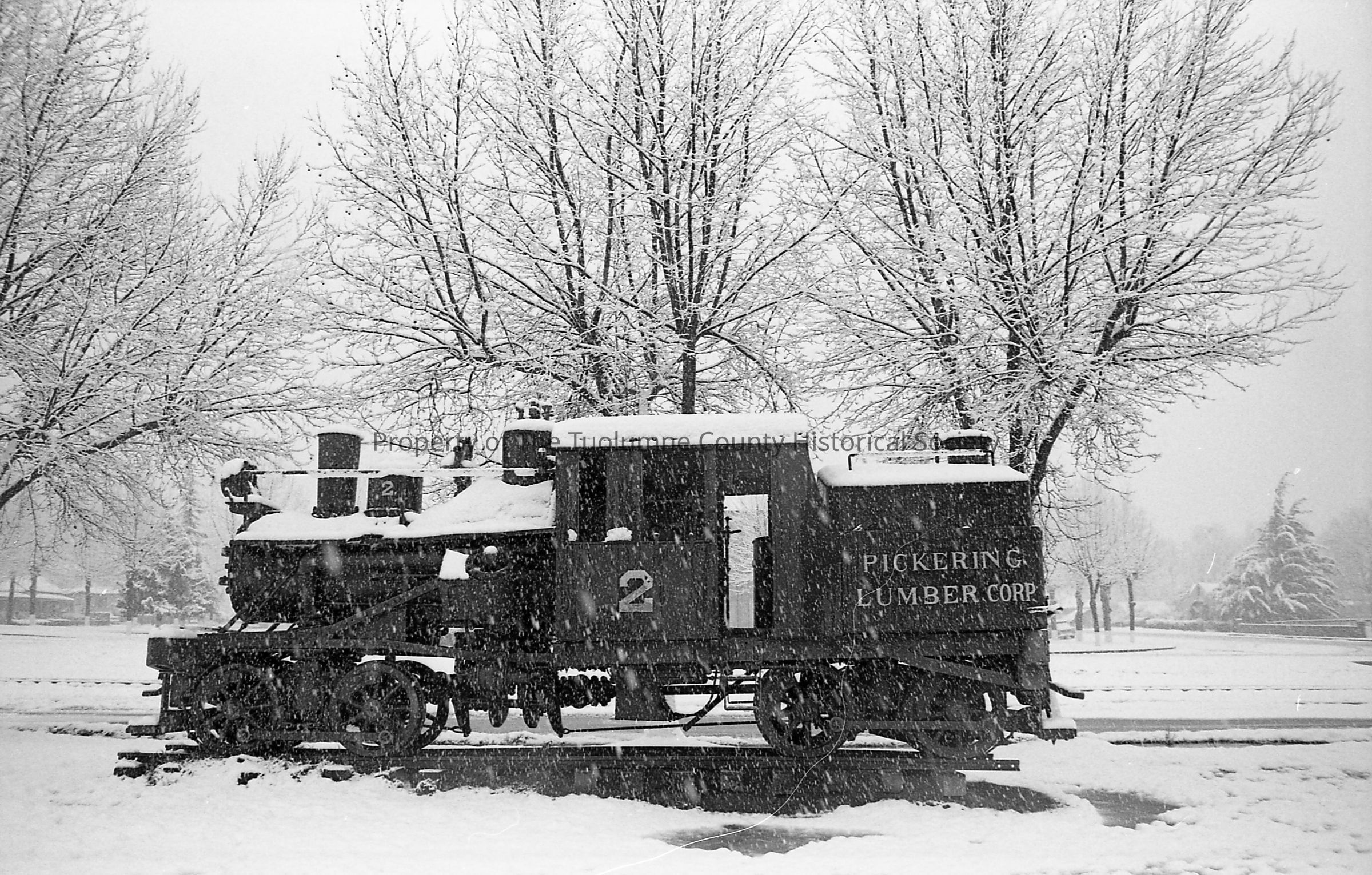 Pickering Lumber Company, Locomotive No. 2 Shay, in Tuolumne Square. Snowing. Three images.