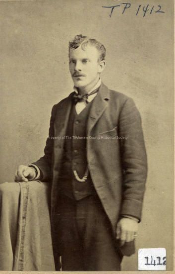 unknown man, Unidentified man, F. W. Baker Studio, Late 1800- early 1900, Men's fashion, Men's hair Styles, Men's facial hair, Unidentified man, 3/4 portrait, he is pictured standing next to cloth covered table, his right arm resting on the table, he is wearing dark trousers and vest under a lighter colored finger length single breasted coat with smallish lapels, vest is buttoned up the center and watch chain is visible in third button hole from the bottom. He's wearing a white shirt with wing collar and soft bow tie, his hair is cut short above his ears and parted off center, combed to the right, small moustache, small lip beard he is otherwise clean shaven.