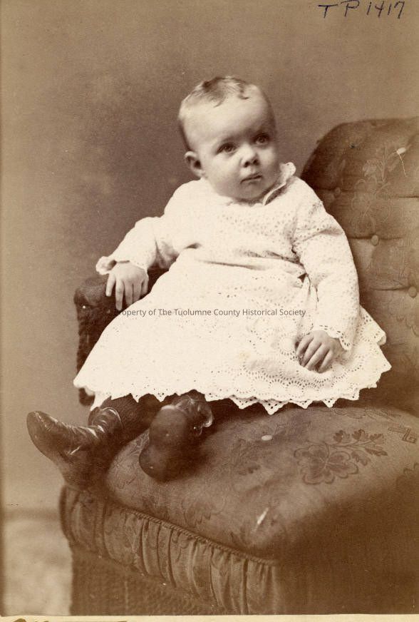 unidentified baby, Unidentified infant, Cabinet card, Late 1800- early 1900, Infant fashions, Hand crocheted dress, Upholstered chair, Wells Studios, Sonora, Unidentified infant, full length portrait, cabinet card, baby is seated on upholstered chair,wearing a crocheted dress, high buttoned shoes, hair is minimally center parted.