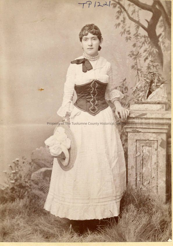 Unidentified young woman, full length portrait, cabinet card, subject is pictured in studio setting with wooden column, grassy floor, flowers and tree backdrop, she is wearing summer white with 3/4 length sleeves ending in soft ruffle, her skirt has smooth front, several tucks around the bottom edge and finished with ruffled eyelet hemline, the upper bodice has lace collar slightly below neckline, satin girdle, triple row of pearls tied with ribbon the same color as the girdle, she is holding a straw hat decorated with white. He hair is soft, pulled back over her ears and dressed in a knot at the nape. She is wearing pearl earrings.