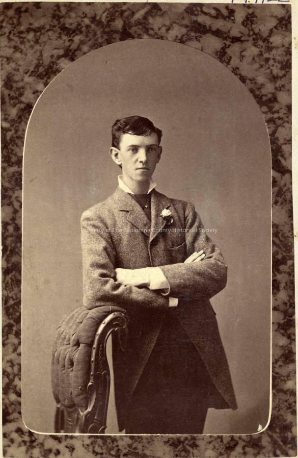 Fashion, People, unidentified young man, late 1800- early 1900, Men's fashions, Men's hair style, Furniture, Wells and Sears Studio, Sonora, Unidentified young man, 3/4 length portrait, cabinet card, he is posed leaning on an upholstered chair, arms akimbo, with right elbow resting on chair back, subject is wearing tweed frock coat with moderate lapels. Dark trousers, white shirt with wing collar and dark ascot secured with jewelled stick pin, cuffs are shot below the coat sleeves, he has a white flower in his lapel, his hair is trimmed short above his ears, parted on the left and combed to the right. Photo is placed on a "tortoise" shell mat.