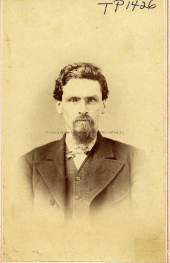 People, late 1800- early 1900, Men's fashion, Men's hair styles, Men's facial hair, Unidentifed man, Sewell's Art Gallery, Unidentified man, vignette portrait, pocket card, he is pictured wearing a dark coat with wide lapels over a lighter vest and white shirt, spread collar and printed ribbon tie, he has full moustache and goatee, his wavy hair is combed straight back with no part, slightly long but neat over the ears.