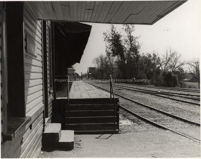 The Sierra Railroad depot in Jamestown before it burned down in 1979. The picture is an 8 x 10 black and white matte. The picture shows the old depot in the back, looking down the building, and the tracks towards the water tank. The date Feb. 1, 1970 is stamped on the back.Collection