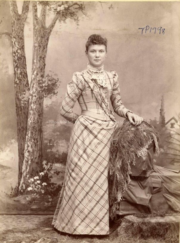 Fashion, Photography, 1860 - 1910, Clothing, women's, Curls on top, Hair style, women's, lace jabot, Women in plaid dress, OUT OF ORDER (SEE FOLLOW-UP)