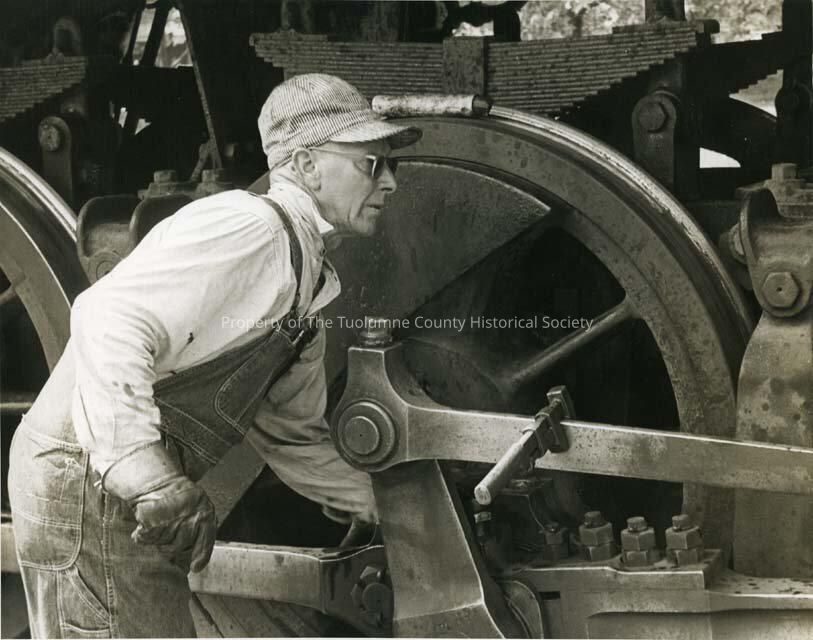 Sierra Railroad. The back of the picture says "cone off the larger engines 34-36-38". The man is making a rod adjustment of the visible drive rods. A black and white photo.Collection