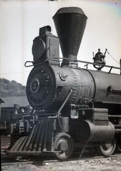 6-R Engine No. 3 of Sierra Railway company with old head lgiht and flared smoke stack taken at shop in Jamestown, March 1932. Leonard Ruoff - Just show the front of the engine. They would also change the cow catcher as well as the headlight and smoke stack to change the look of the train for movies.Collection