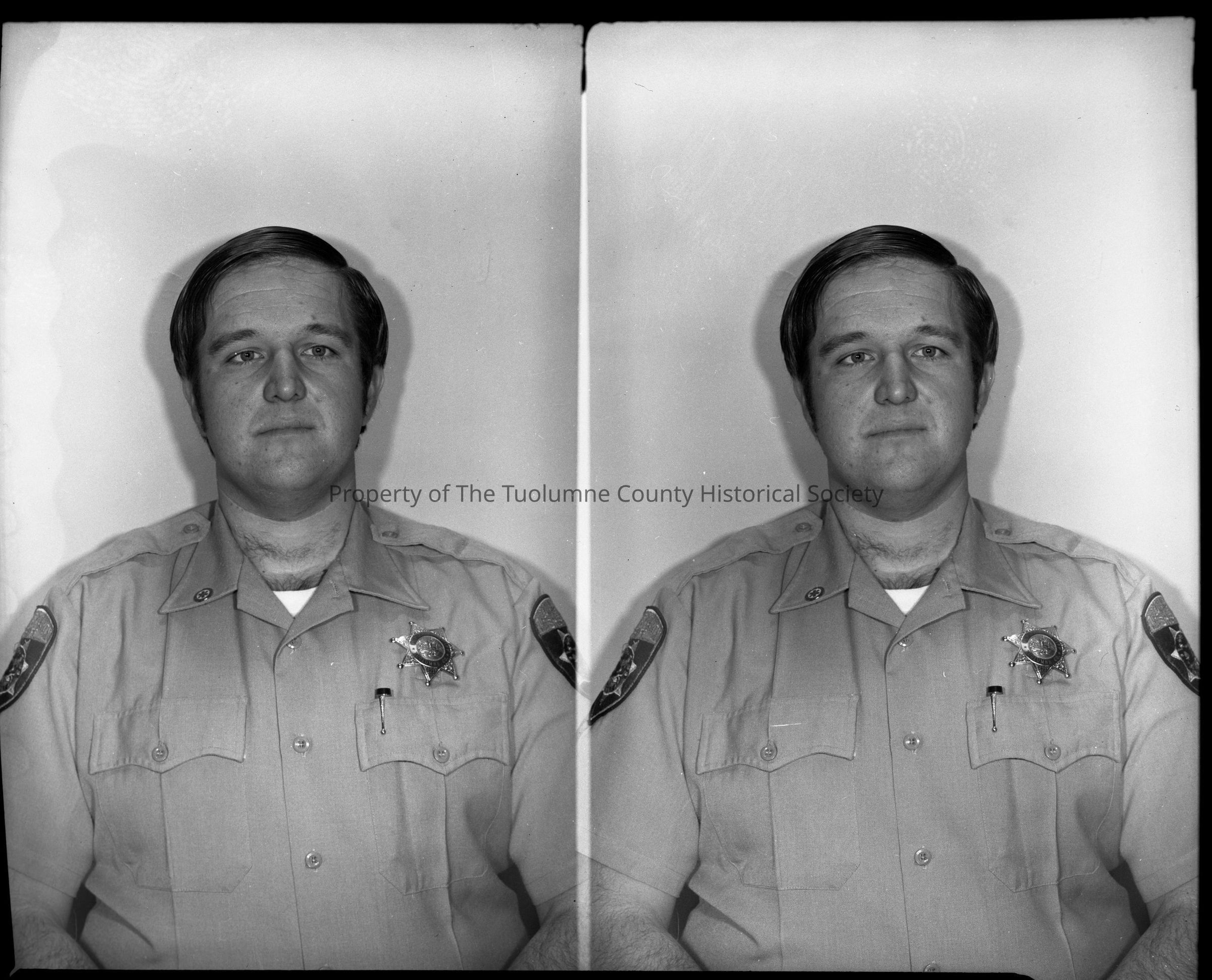 Black and white photo negative taken to be used to identify members of the Tuolumne County Sheriffs Office. Tuolumne County Jail Employee, not identified.Collection