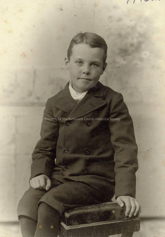 Portrait-Boy-not identified. He is sitting on a stool. He is wearing a suit type jacket with large lapel and a double row of buttons down the front. His pants are knee length and his socks are long. Type: Paper