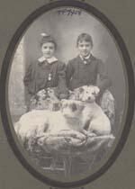 Portrait-Young Boy and Girl with 2 dogs. Not identified. Type: Paper