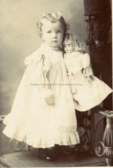 Portrait-small child unidentified. She is standing and holding a doll that is dressed similar to her. She is wearing a dress with long sleeves. Eyelet is at the cuffs and hem.