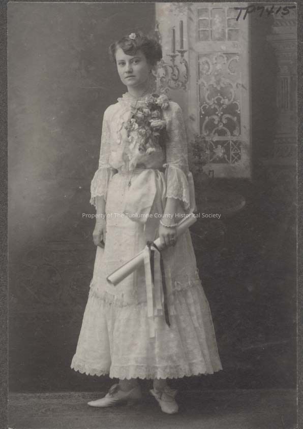 Unidentified young lady at her graduation. She is wearing a nice longish frilly flower-adorned dress., Biography, unidentified Girl