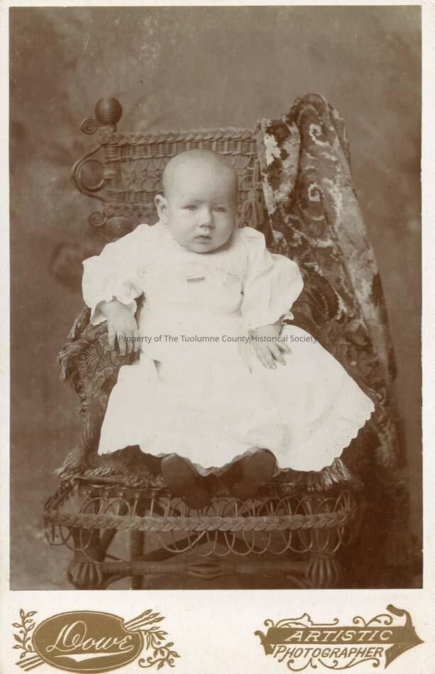A black and white portrait of an unidentified baby sitting chair with printed cloth thrown on back of chair .(Possibly same baby as in TP12632?)