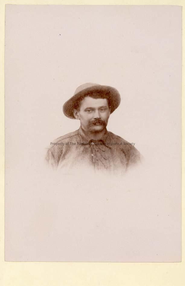 A Black and white portrait of an unidentified man wearing a stripe shirt, ( possibly early western style), hat, dark hair, and mustache.