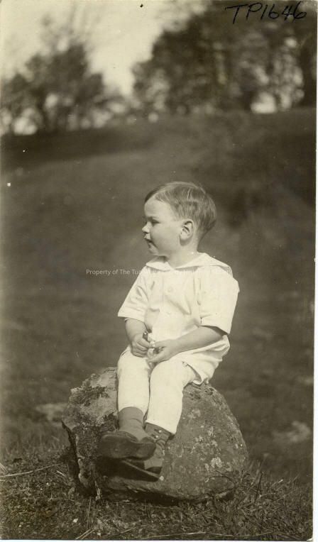 Unidentified boy sitting on a large rock. Unidentified location. He is wearing an outfit with a sailor collar. His boots are high-top.