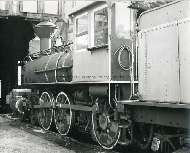 An 8 x 10 black and white photo of Sierra Railroad Engine #3 at the Railtown Roundhouse, in Jamestown. The engine is a 4-6-0 Rogers, and is all spruced up with a new stack, and ribbon tapes on the wheels, and other places. The date Aug 24 1970 is stamped on the back of the photo. The engine can be seen at the entrance to the roundhouse.Collection