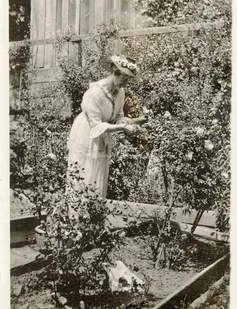 A photo of an unidentified lady in a Rose Garden. She is wearing gloves and is cutting the roses. Type: Paper