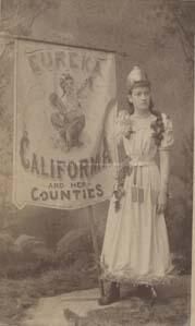 A young woman, standing by a flag that says, "Eureka, California and her Counties."