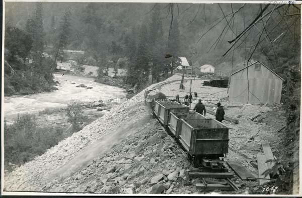 Hetch Hetchy. Early Intake. Track with cars on it. Unidentified Workers beside rail cars. River shown on left side of photo. Several wooden buildings. Trees in background.