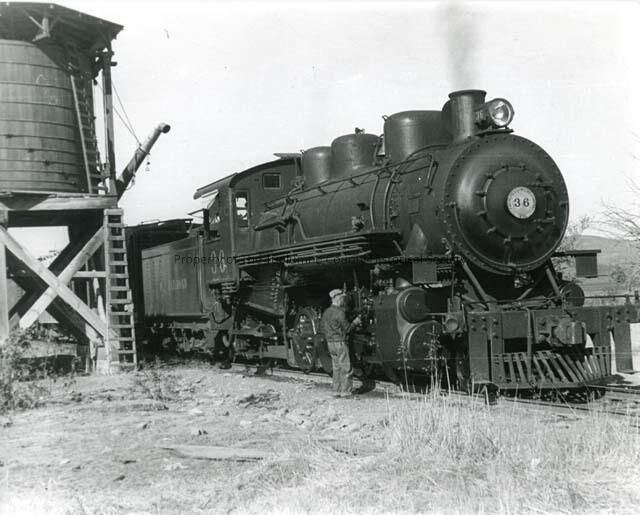 An 8 x 10 black and white photo of Sierra Railroad Engine #36, being oiled up at the Jamestown yard. The man's name is not given, and his face cannot be seen. The water tank can be seen at the left of the picture.Collection