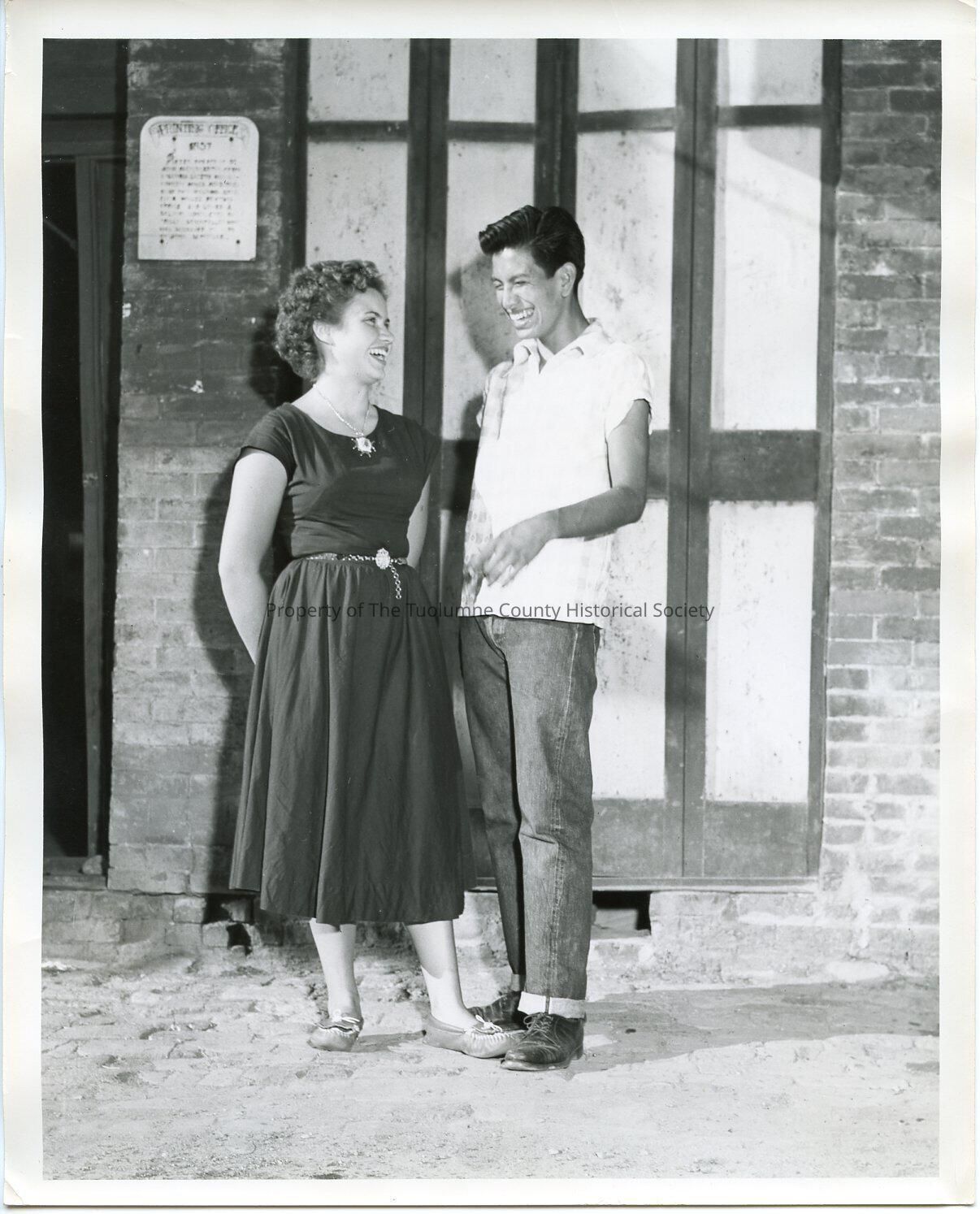 A 8" x 10" Black and white photo of an unidenified young lady and young man standing outside by an old building.Collection