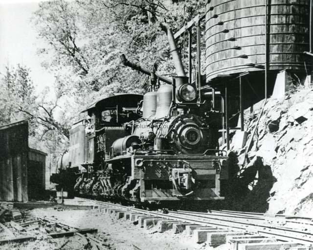 A black and white photo of West Side Lumber Company's Shay Engine #14, at the engine services facilities, located at the Tuolumne mill. The engine can be seen by the water tank, and there is a little shed to the left.Collection