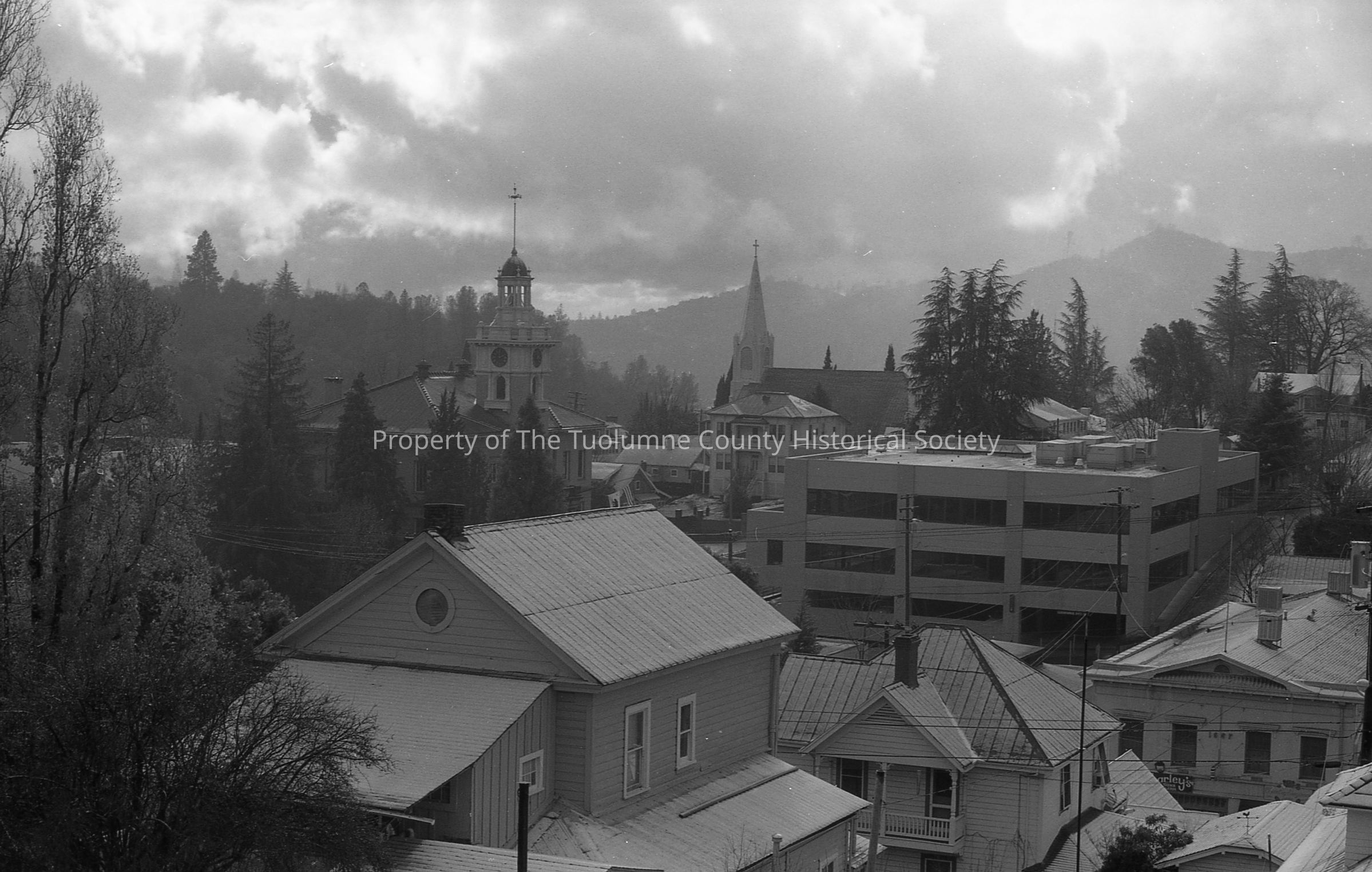 Sonora overview from 92 N. Shepherd St. showing Tuolumne County Courthouse, Tuo. Co. Administrative building, and St. Patrick's Catholic church.Collection