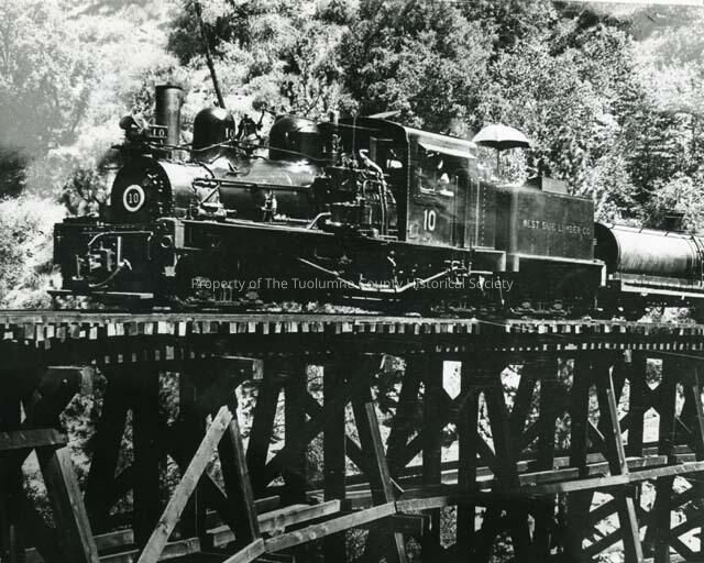 A black and white photo of West Side Lumber Company's Engine #10. The train is in bound on a River Bridge. You can see the engine, and the first tank car. You can see the engineers arm. There is an umbrella behind the engine.Collection
