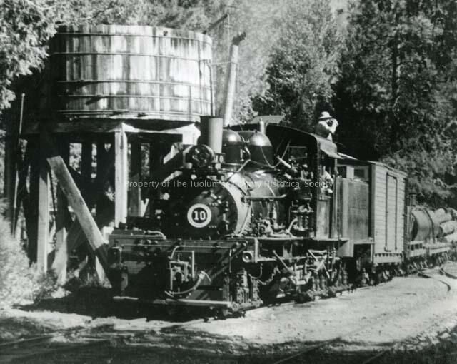 A black and white photo of West Side Lumber Company's Engine #10, at the Camp 8 water tank. The train is loaded with logs, and there is a man standing behind the engine cab, either looking out of binoculars, or drinking something.Collection