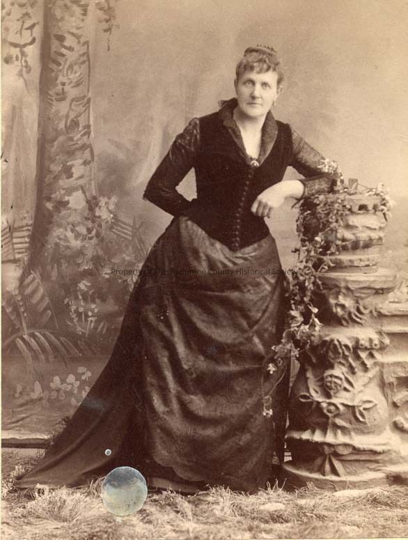 A black and white portrait of an unidentified lady. Wearing long dress with velvet vest section, long sleeves. Light hair worn up with bangs. Standing beside a pedestal with vines on it. Has one arm resting on pedestal.