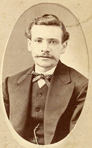 Unidentified man wearing a suit, vest, dress shirt with a stripped bow tie. A watch fob can be seen. He has a muctache. His hair is parted on the side and combed back. Type: Paper