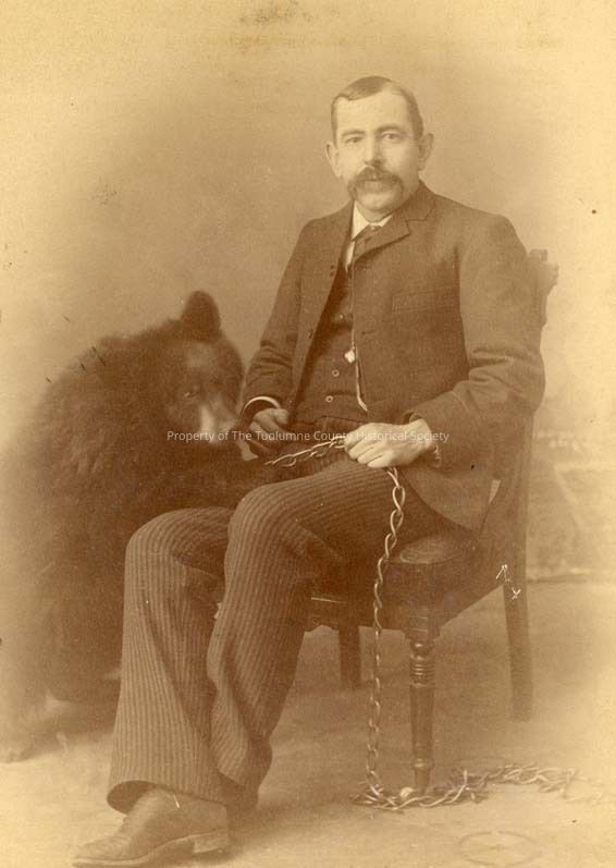 A black and white portrait of an unidentified man sitting in a chair with bear on chain beside him. He is holding the chain. Wearing suit with watch chain on vest. Hair has side part and has mustache. Type: Paper