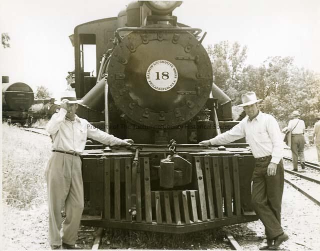 A black and white photo of Sierra Railroad Engine #18 at the Jamestown yard. Possibly the 1950's. The engine is shown from the front, and there are two men standing on each side of it at the front. There are two people walking down the track on the right of the engine. The engines boiler plate has the words "Baldwin Locomotive Works - Philadelphia, U.S.A. The detail is good.Collection