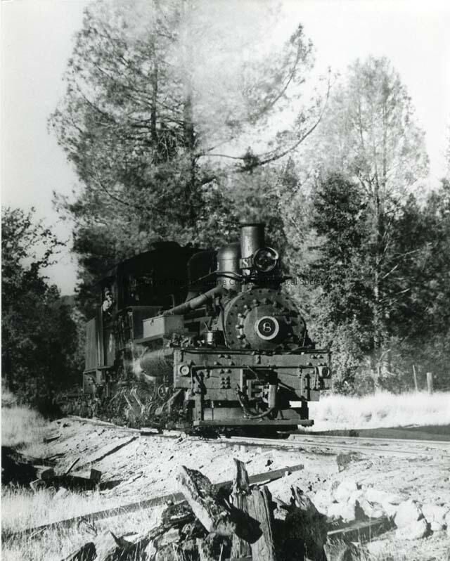 A black and white photo of West Side Railroad's Engine #8 coming into Tuolumne. It is just outside of the mill gate. The engine is moving, and the engineer can be seen at the window of the engines cab.Collection