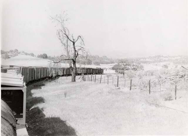A black and white photo of Sierra Railroad Combine #9 traveling eastbound out of Oakdale. The end of the train can be seen as it curves around a bend. There is a tree at the center of the picture, and you can see the number 391 at the bottom left of the picture.