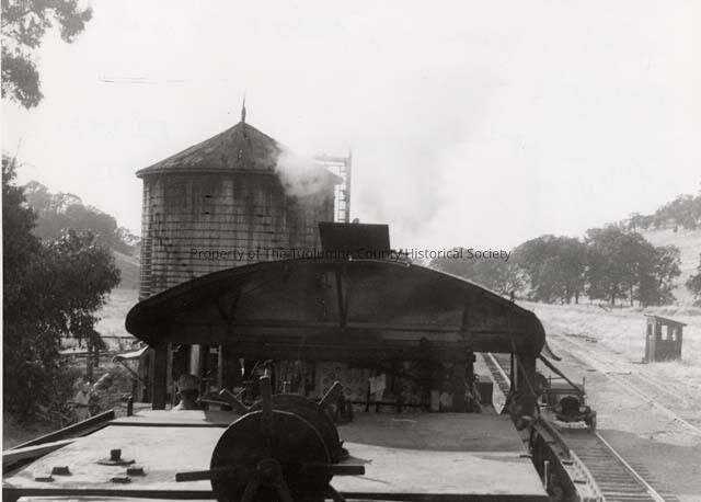A black and white photo of Sierra Railroad at Cooperstown. The picture shows the water tank in front of the engine, which is seen from the rear. There is also a small shed on the right of the track, and there is a Model T on the track to the right. The back of the picture says "Motel T #8 in background".Collection